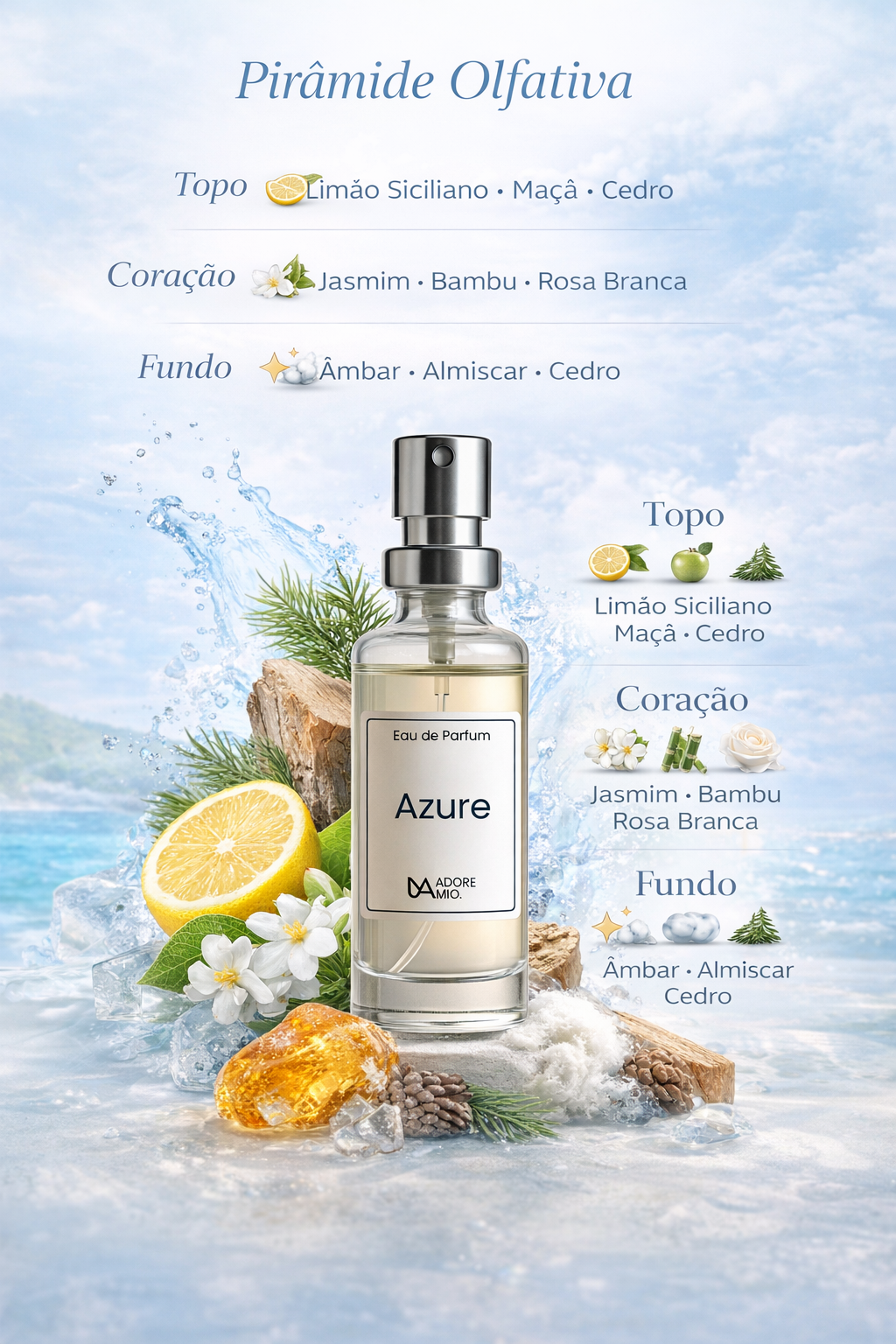Azure é uma fragrância fresca, luminosa e sofisticada, criada para quem ama perfumes leves, vibrantes e cheios de energia. Inspirado no frescor mediterrâneo, ele traduz a sensação de dias ensolarados à beira-mar, com uma combinação envolvente de notas cítricas, florais delicadas e um fundo limpo e confortável.