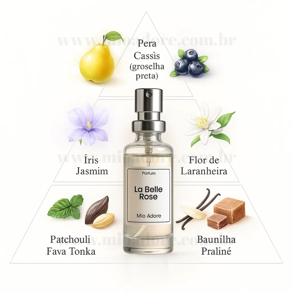 A saída combina a suculência da pera com o frescor do cassis. No coração, flores nobres como íris, jasmim e flor de laranjeira criam um bouquet elegante e feminino. O fundo cremoso de patchouli, pralinê, baunilha e fava tonka garante uma assinatura irresistivelmente gourmand, que permanece por horas na pele.