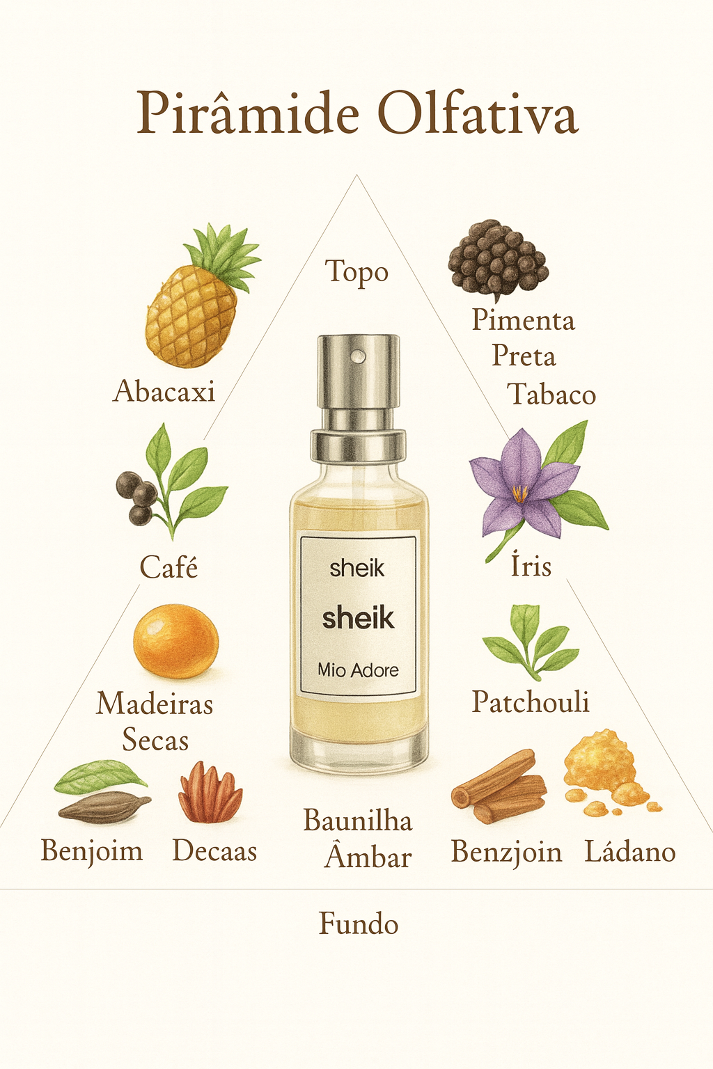 O Sheik foi desenvolvido para homens que apreciam fragrâncias orientais potentes, com presença e performance. Seu blend de especiarias, tabaco, café e acordes ambarados proporciona alta projeção e incrível fixação, tornando-o um perfume memorável — daqueles que deixam rastro e despertam elogios.